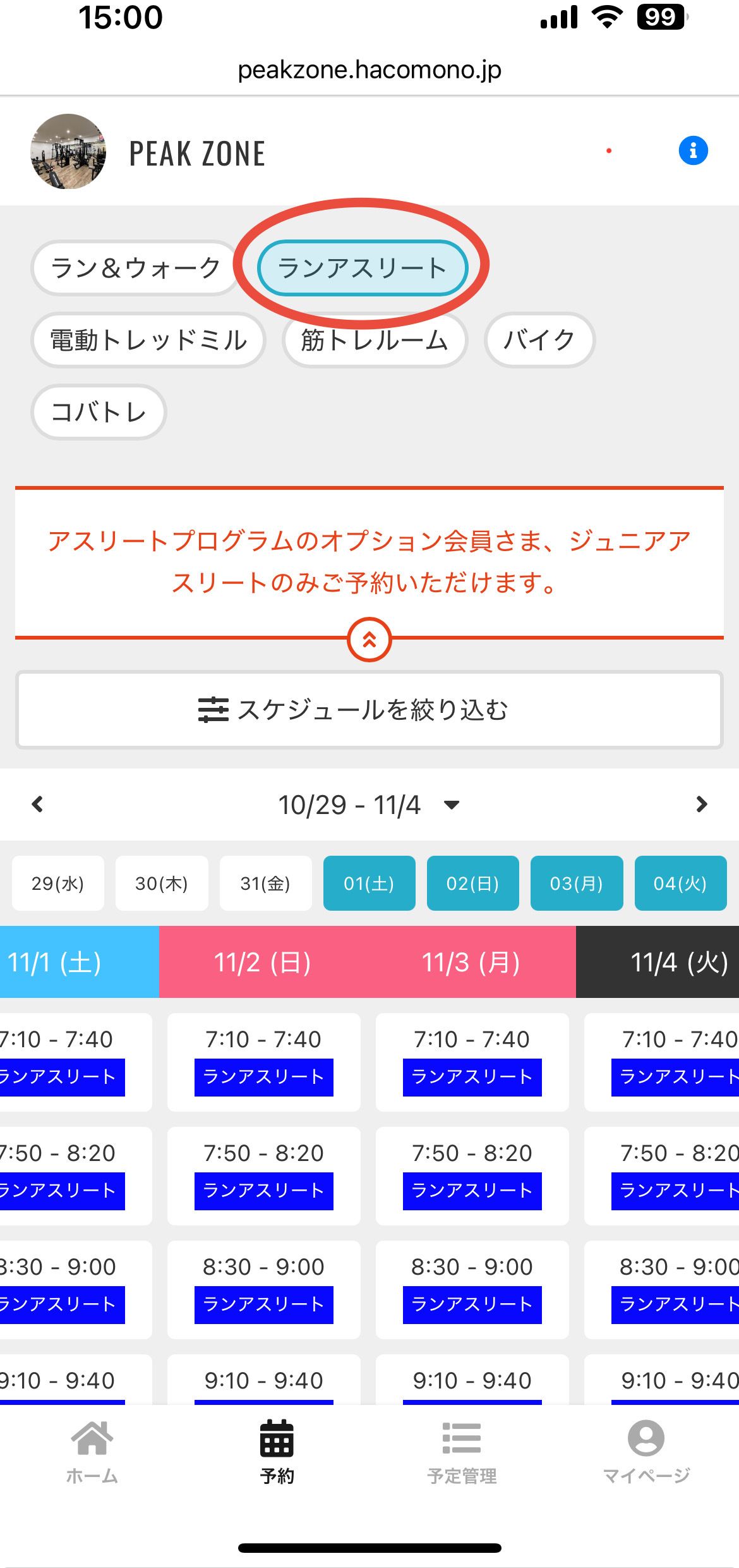 ジュニアアスリート会員様、アスリートプログラムオプション会員様のみご予約いただけます。